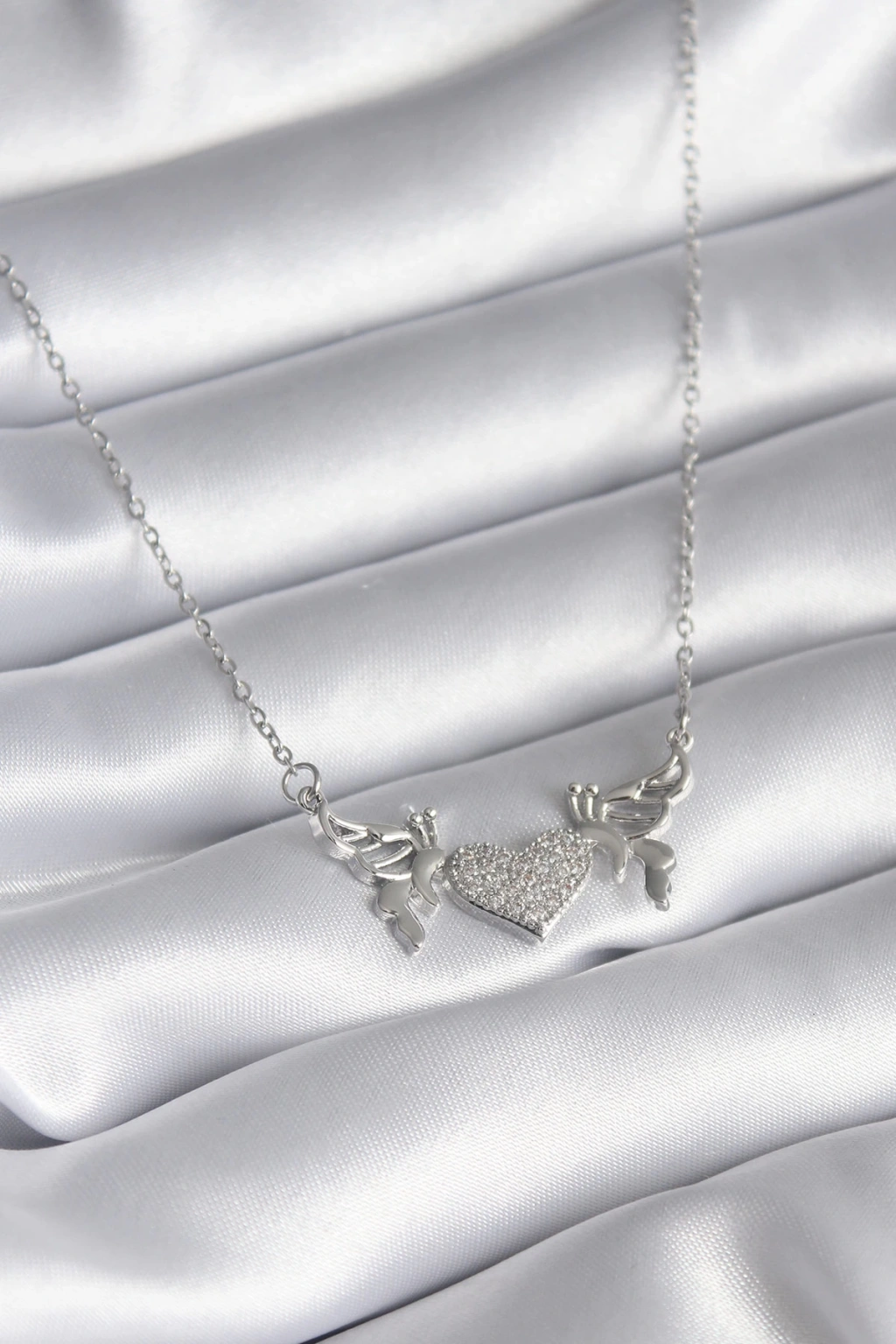 316L Çelik Gümüş Renk Zirkon Taşlı Kanat Kalp Model Kadın Kolye