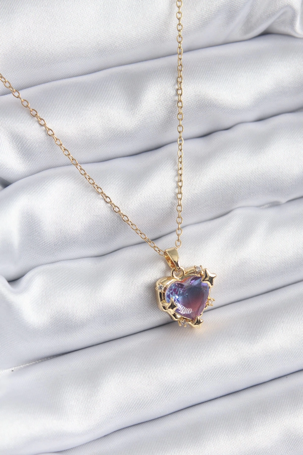 316L Çelik Zincir Gold Renk Mor Renk Zirkon Taşlı Kalp Model Kadın Kolye