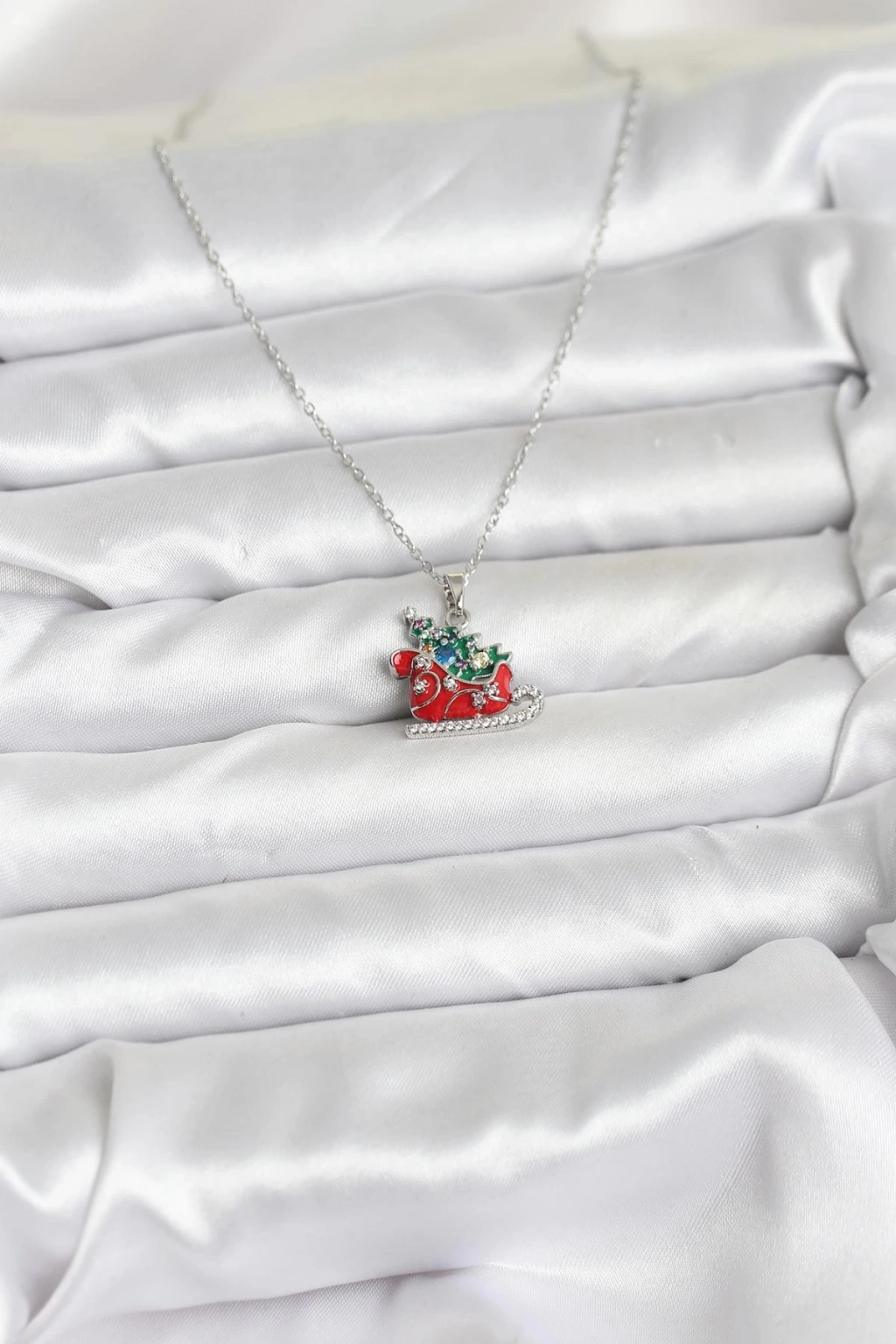 316L Çelik Zincir Gümüş Renk Kızak ve Çam Ağacı Figürlü Yılbaşı Temalı Kadın Kolye