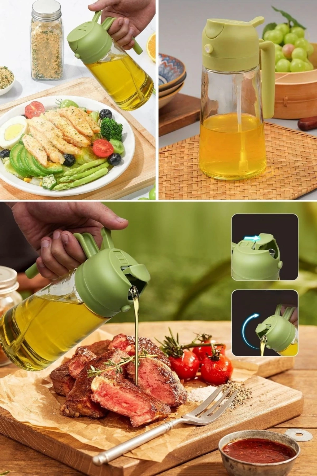 1. Çift İşlevli Kullanım: Tek bir dokunuşla yağı dökebilir veya ince bir şekilde püskürterek yemeğin her köşesine eşit olarak dağıtabilirsiniz. Salatalarda hafif bir sprey, etlerde ise yoğun bir lezzet sunmak için mükemmel!