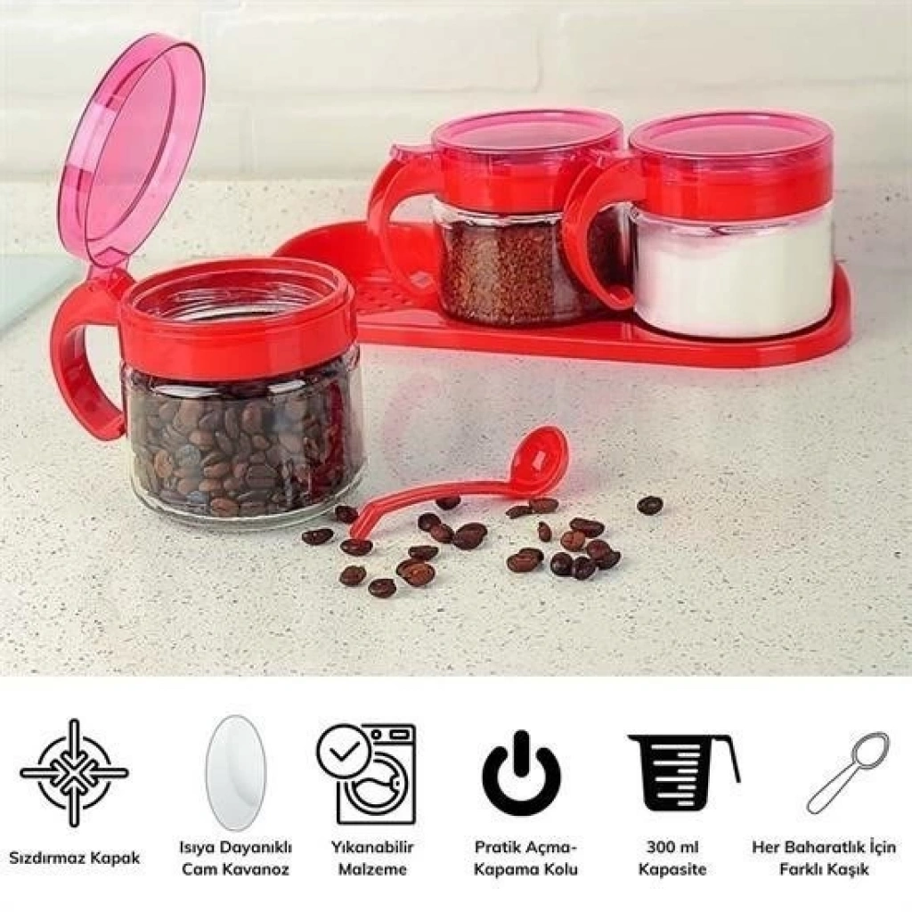 Adshome® Kırmızı 3'lü Standlı Kaşıklı Cam Baharatlık Takımı, mutfağınızda dağınık bir şekilde duran baharatlarınızı düzene sokmak için tasarlanmıştır