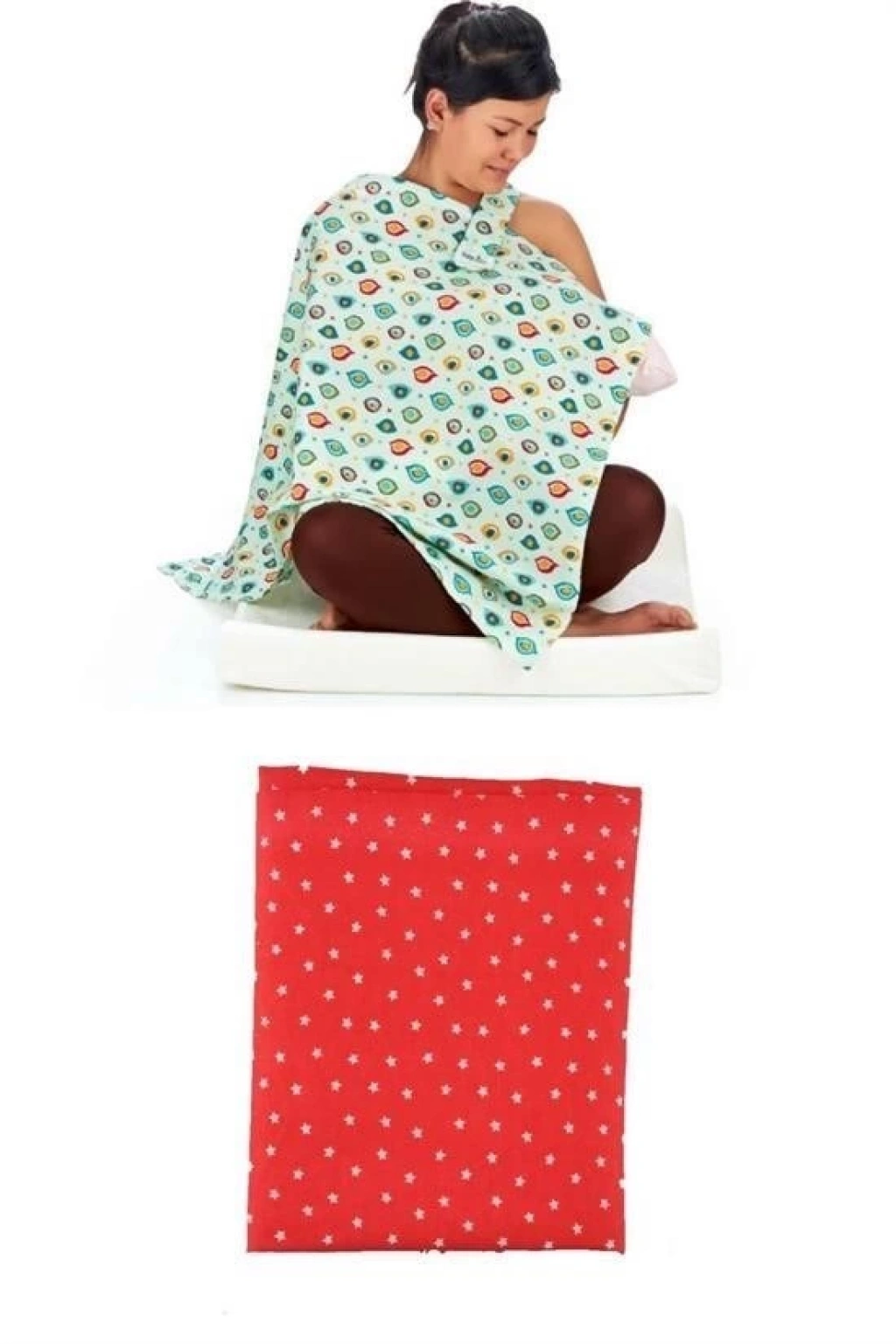 Emzirme Önlüğü Bebek Emzirme Örtüsünde kırmızı kumaş zemini üzerine beyaz yıldız desenleri bulunmaktadır