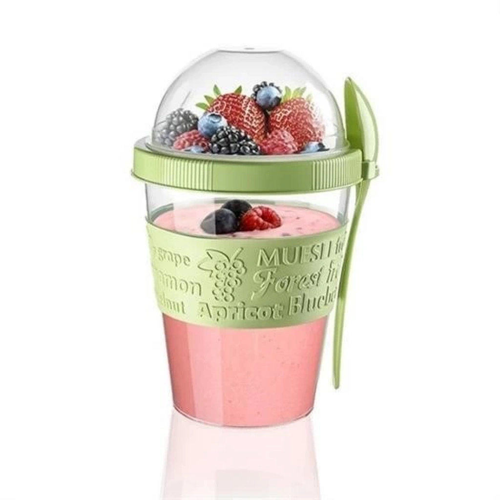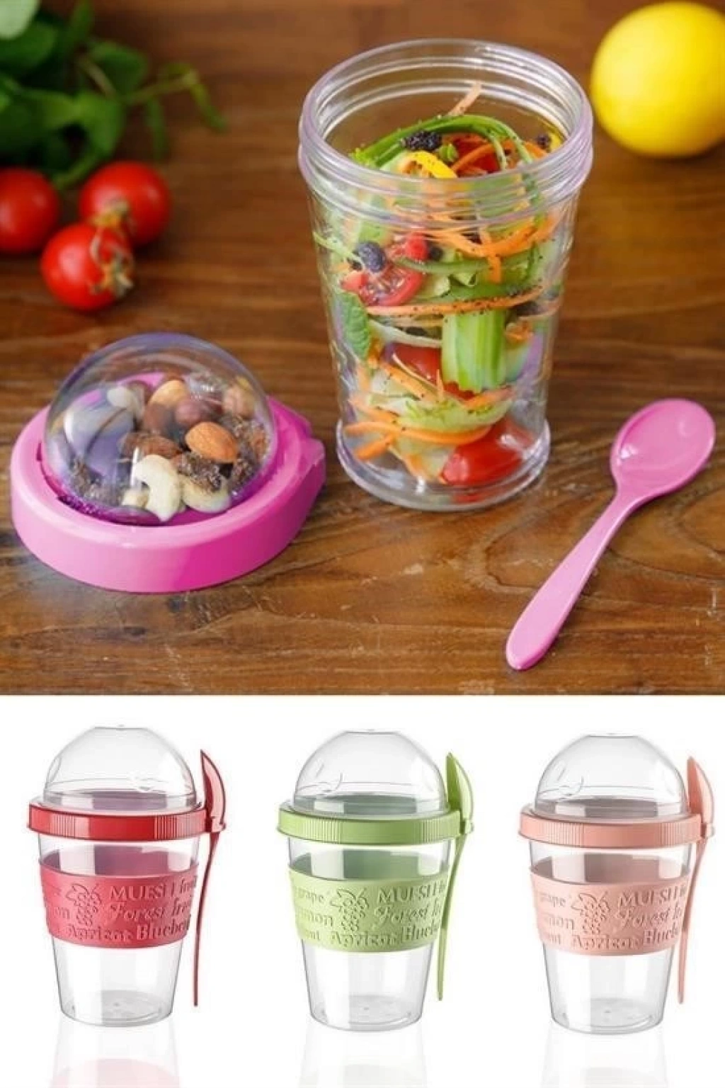 -Özellikle diyet yaparken hafif ve doyurucu atıştırmalıkların tüketilmesi gerektiği zamanlarda çeşitli meyveler, yulaf ve yoğurt birlikteliği ile hazırladığınız ara öğünlerinizi muhafaza edebileceğiniz kapaklı kaşık hazneli yoğurt kabıdır