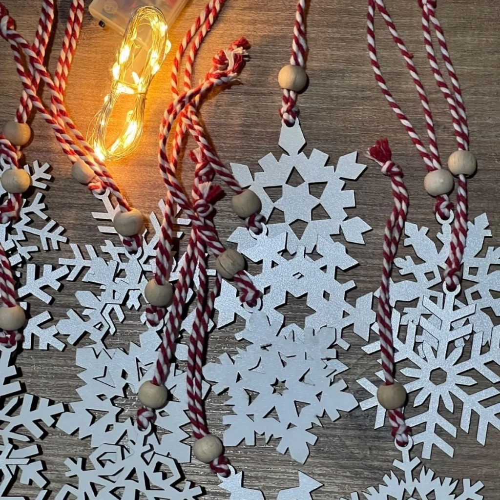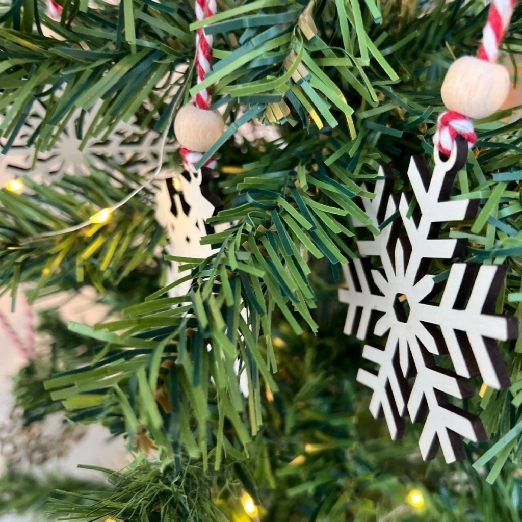Adshome® Pilli Peri Ledli 6 Parça Kırmızı Beyaz İpli Kar Tanesi Model Ahşap Yılbaşı Ağaç Süsü