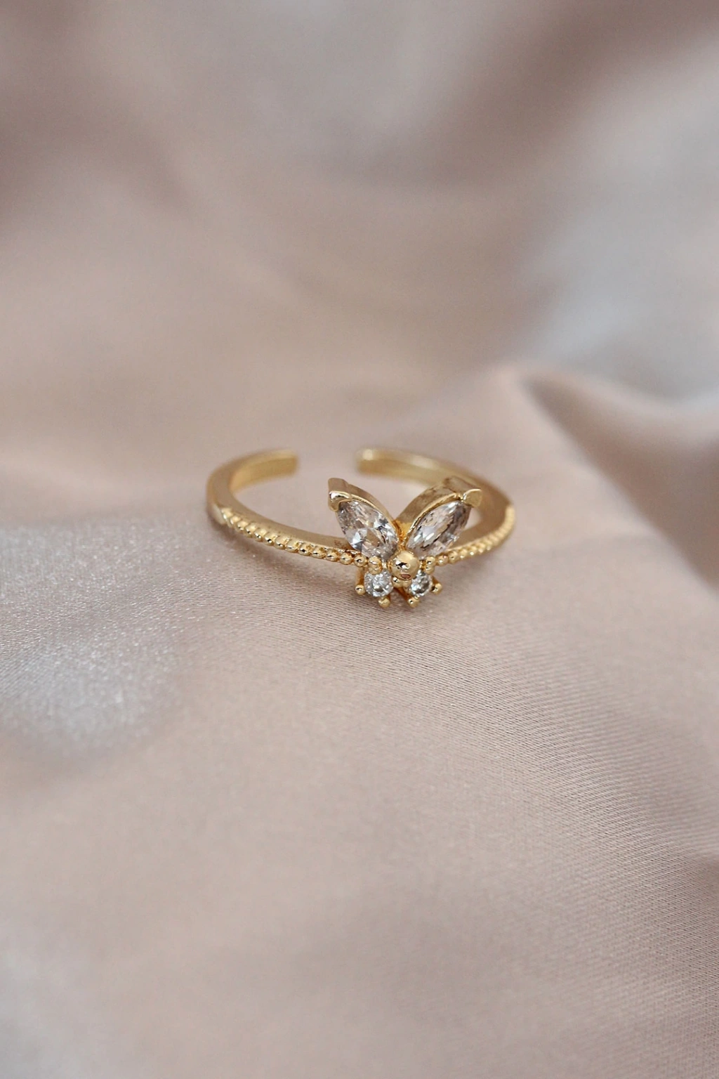 Ayarlamalı Altın Renk Metal Zirkon Taş ve Kristal Taşlı Kelebek Model Yüzük