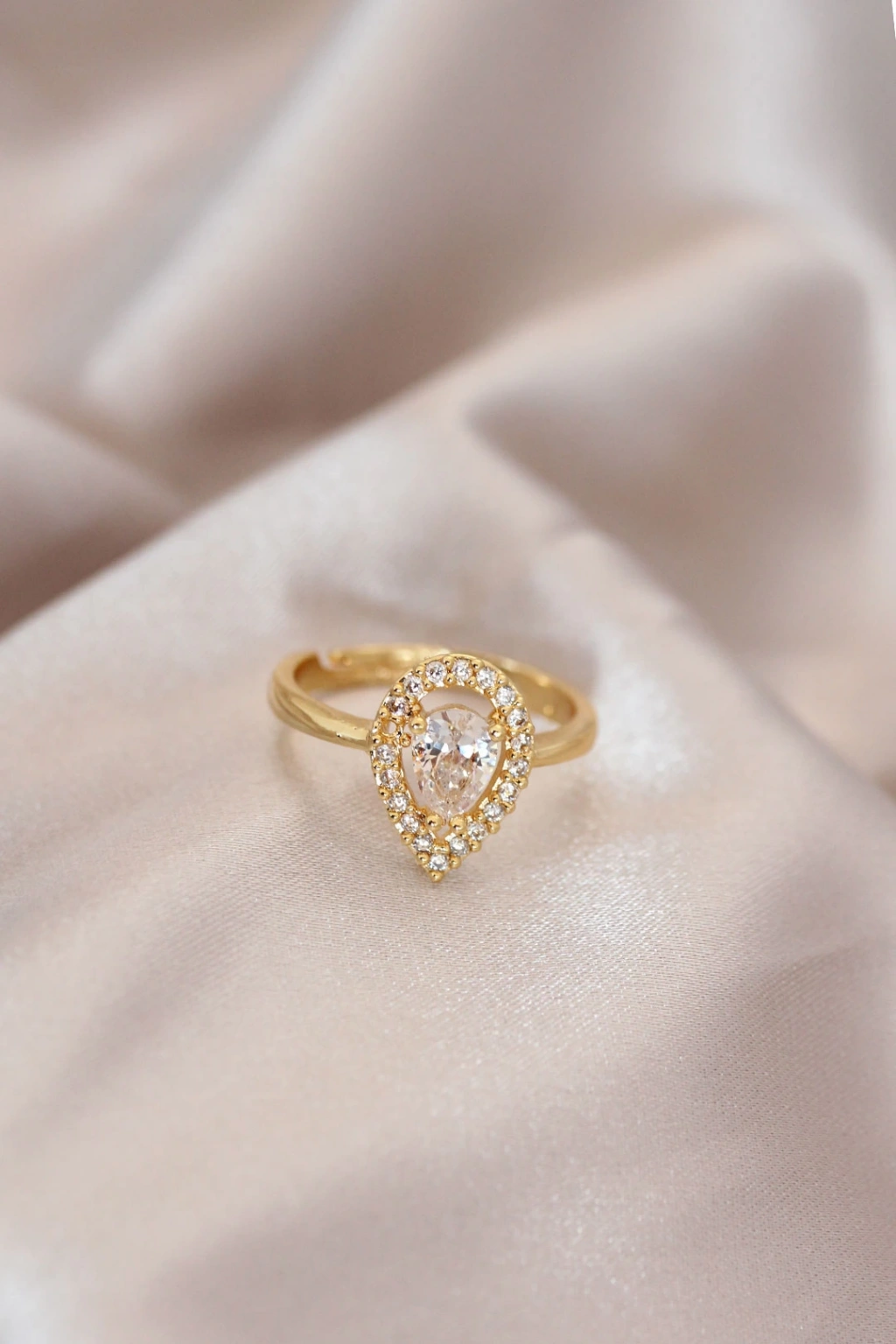 Ayarlamalı Gold Renk Metal Zirkon Taşlı Damla Model Yüzük