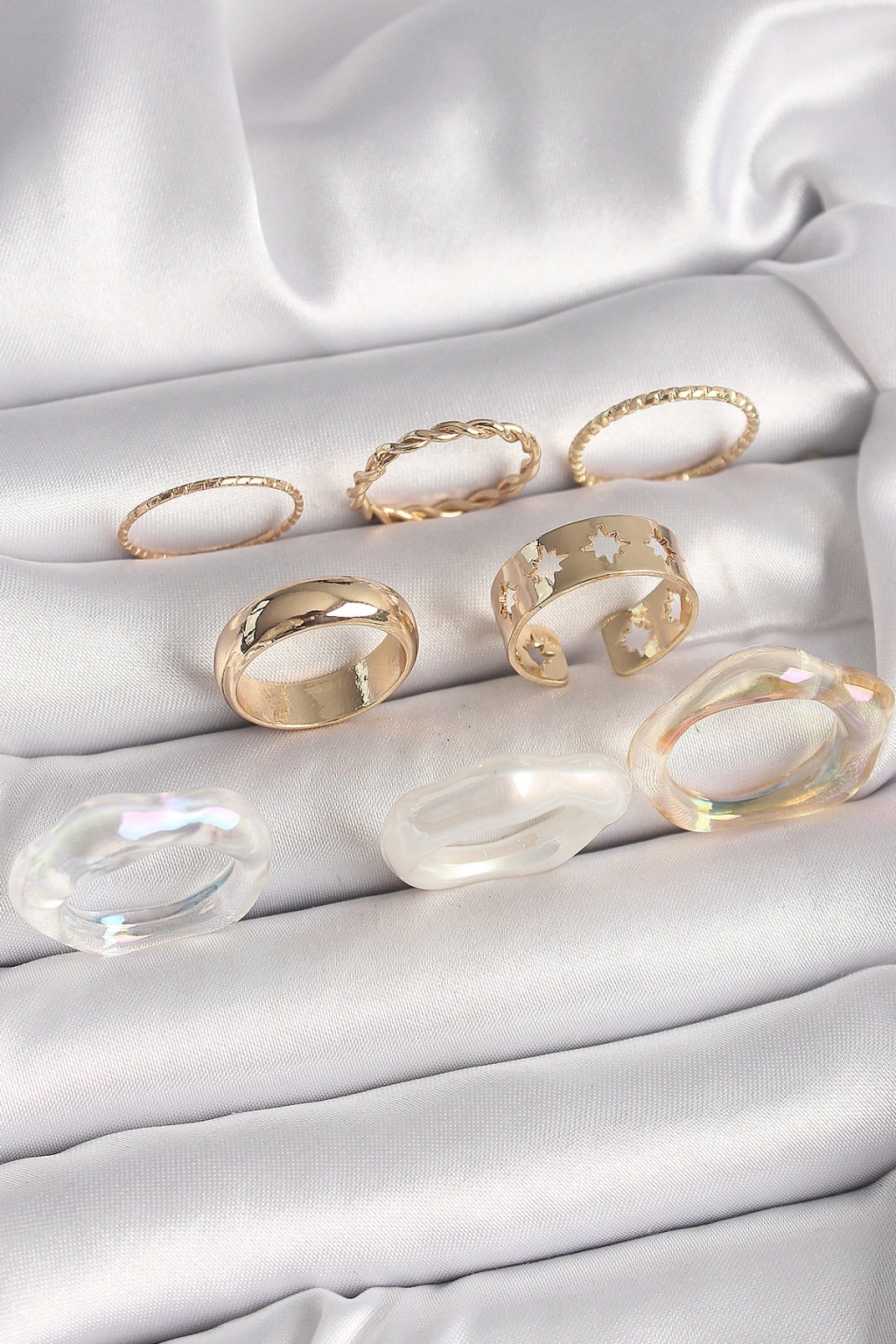 • Pirinç Gold Renk Beyaz Akrilik Plastik Modek Kutup Yıldız İşleme Detay Kadın Yüzük Kombini
