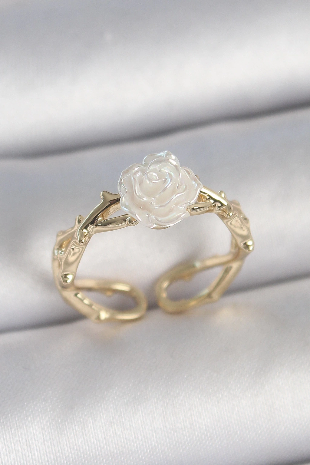 Pirinç Gold Renk Beyaz Gül Model Ayarlanabilir Kadın Yüzük
