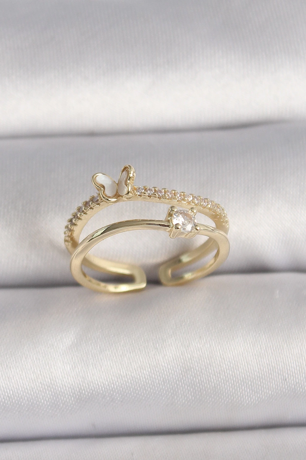 Pirinç Gold Renk Zirkon Taş Detaylı Kelebek Figür Ayarlanabilir Yüzük