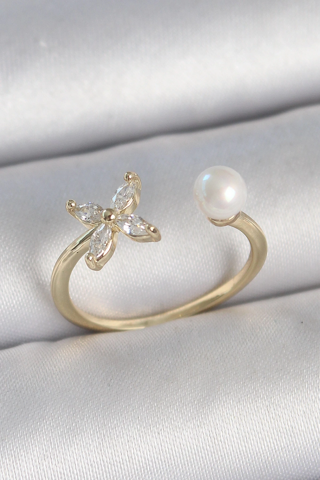 • Pirinç Gold Renk Zirkon Taşlı Çiçek Model İnci Detay Ayarlanabilir Kadın Yüzük
