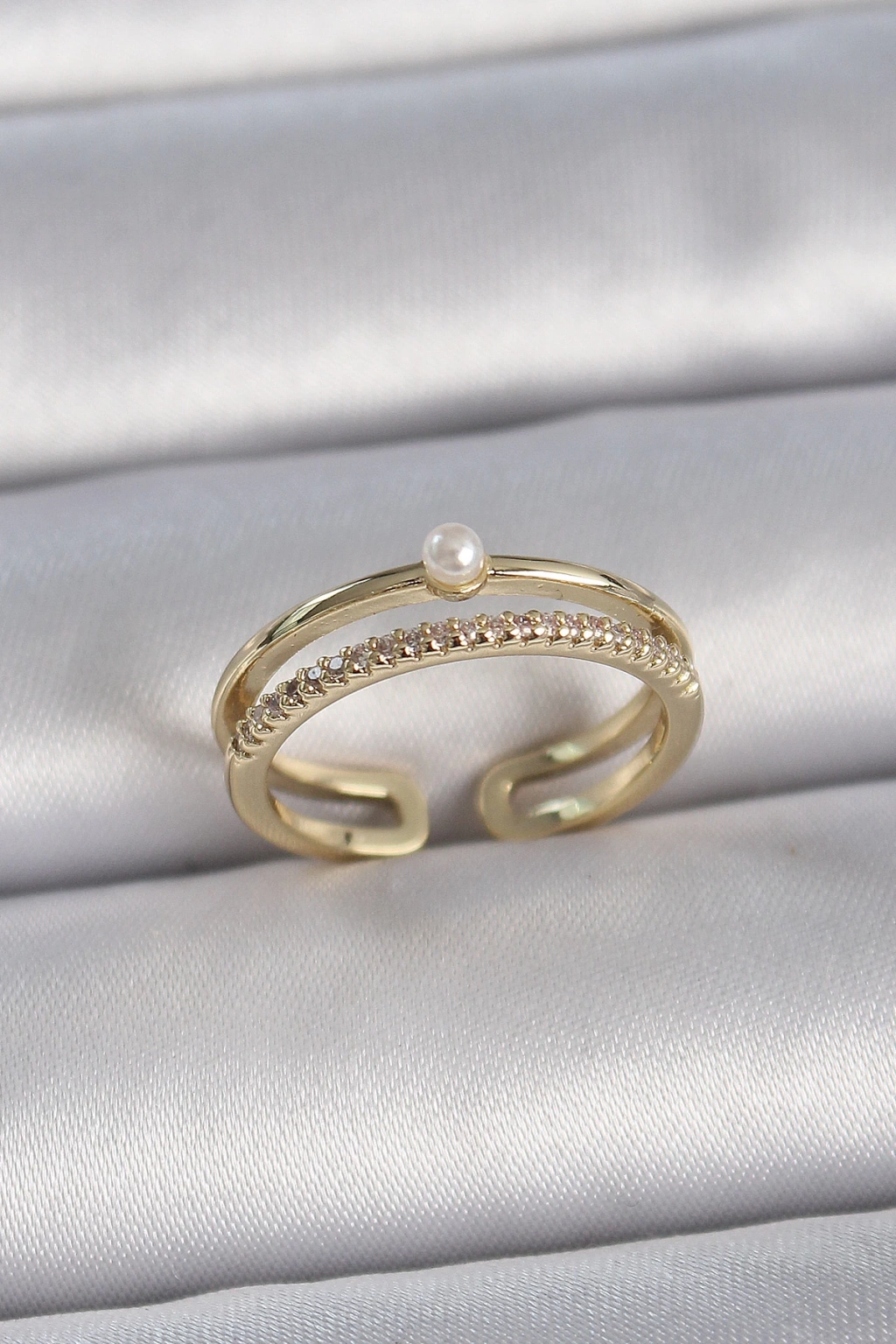 • Pirinç Gold Renk Zirkon Taşlı İnci Detay Ayarlanabilir Model Kadın Yüzük
