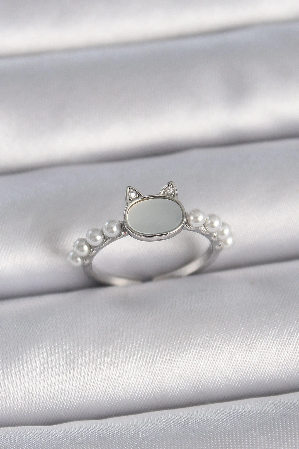 • Pirinç Gümüş Renk Ayarlanabilir Beyaz Mineli Kedi Model İnci Detay Kadın Yüzük