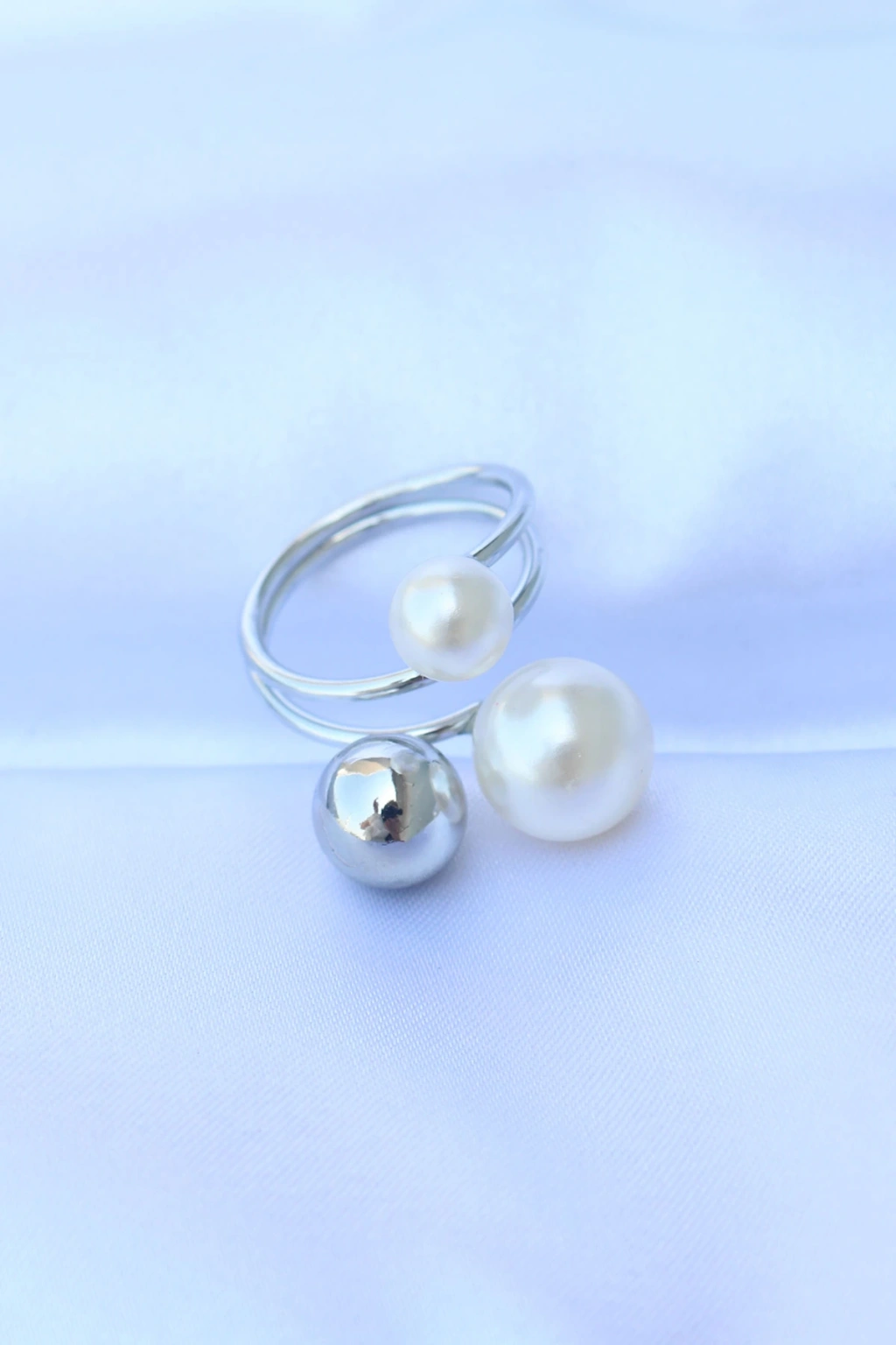 Pirinç Gümüş Renk Ayarlanabilir İnci Taşlı Yüzük