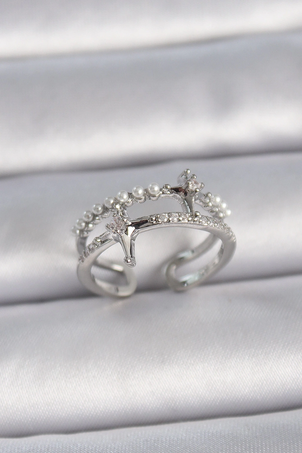 Pirinç Gümüş Renk Ayarlanabilir Zirkon Taşlı Kutup Yıldız İnci Detay Kadın Yüzük