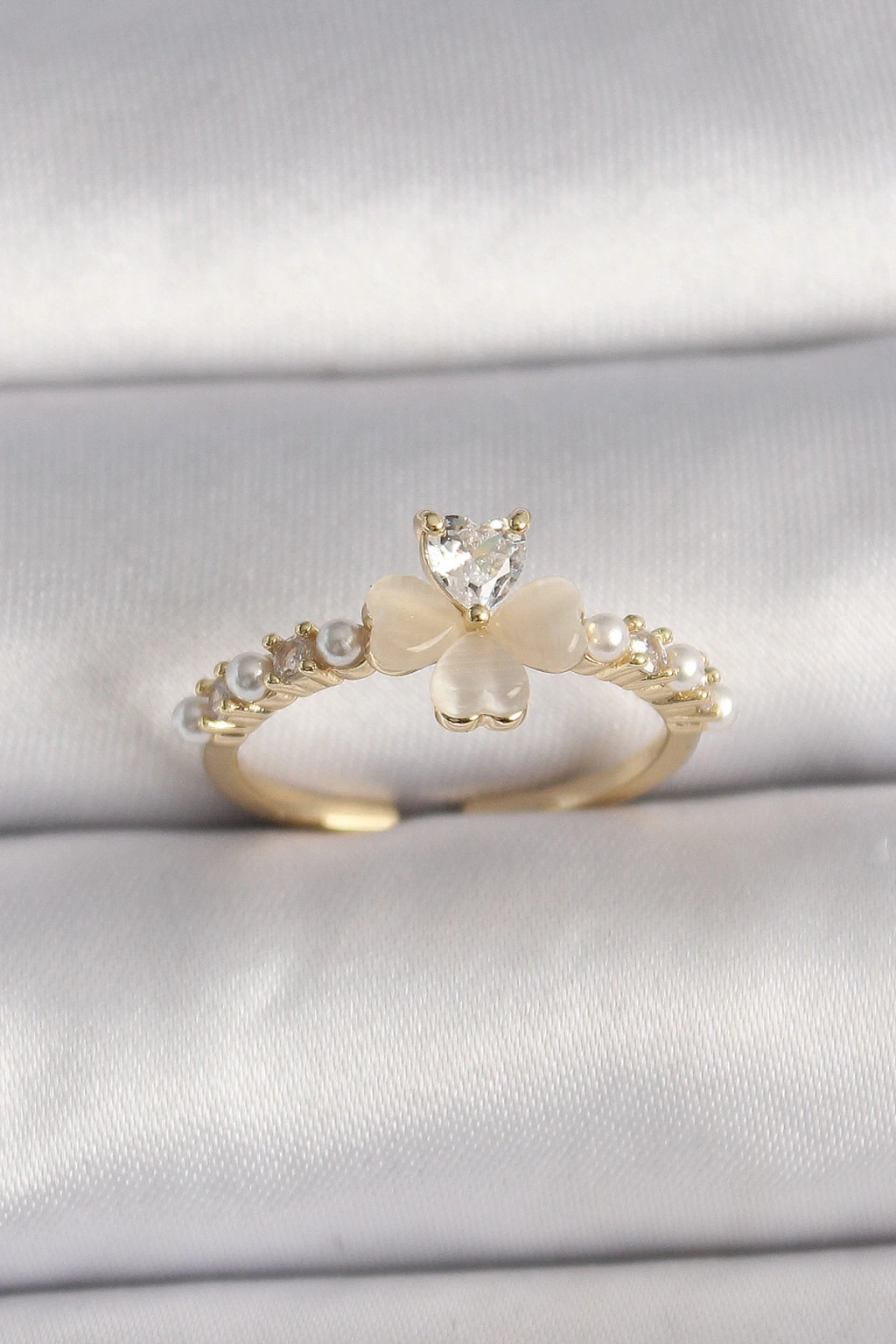 Pirinç Gümüş Renk Zirkon Taşlı Beyaz Mineli Yonca Model İnci Detay Ayarlanabilir Yüzük