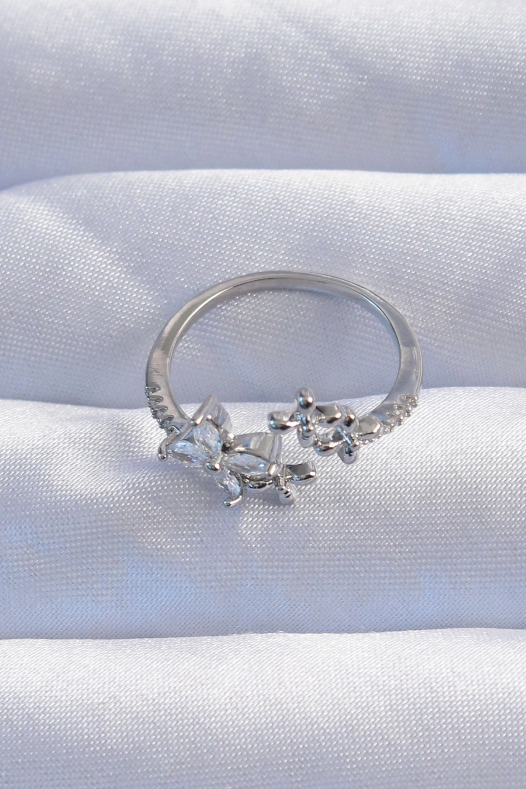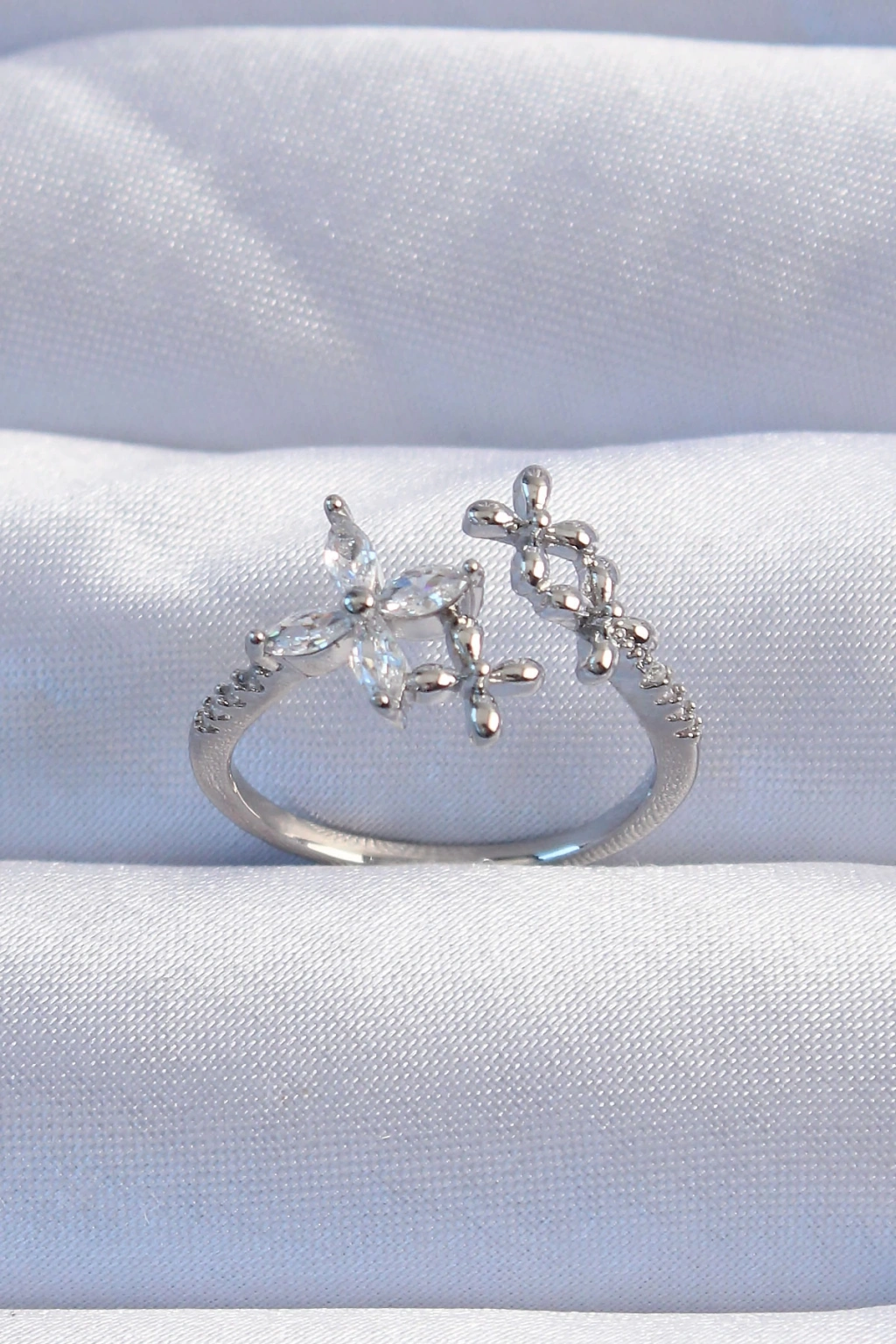 Pirinç Gümüş Renk Zirkon Taşlı Çiçek Model Ayarlanabilir Yüzük