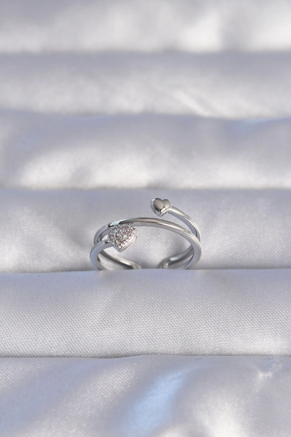 Pirinç Gümüş Renk Zirkon Taşlı Kalpli Model Ayarlanabilir Yüzük