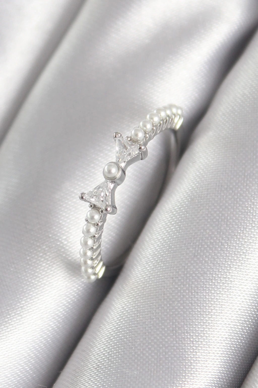 • Pirinç Gümüş Renk Zirkon Taşlı Kurdele Model İnci Detay Kadın Yüzük