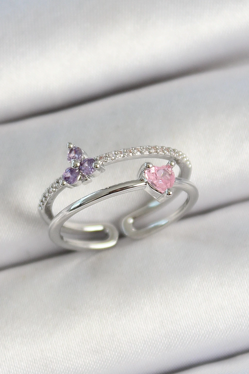 • Pirinç Kalp Ve Çiçek Figürlü Zirkon Taşlı Gümüş Renk Ayarlanabilir Kadın Yüzük