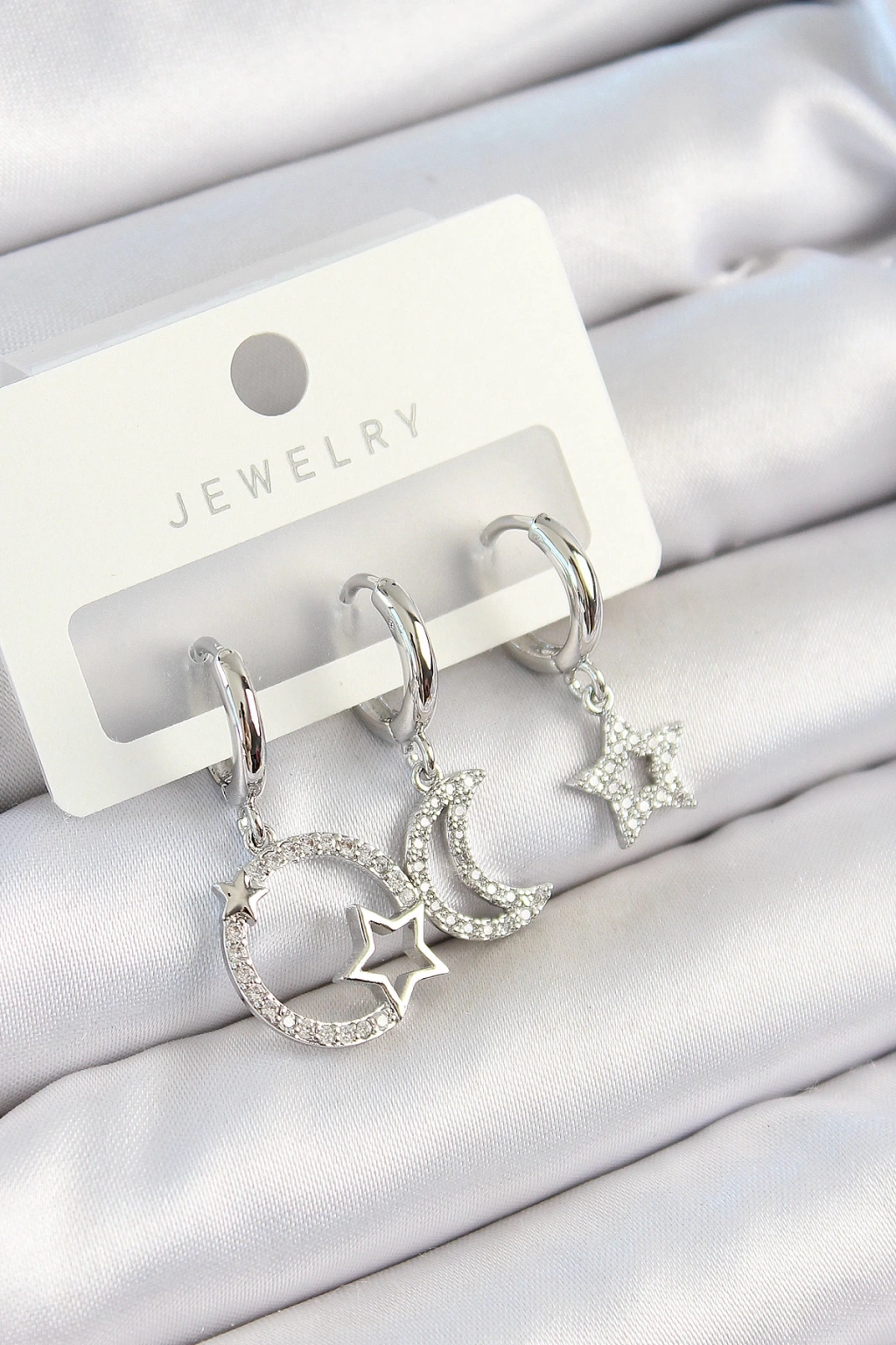 • Pirinç Zirkon Taşlı Ay Ve Yıldız Model Gümüş Renk 3'lü Çift Kadın Küpe Set