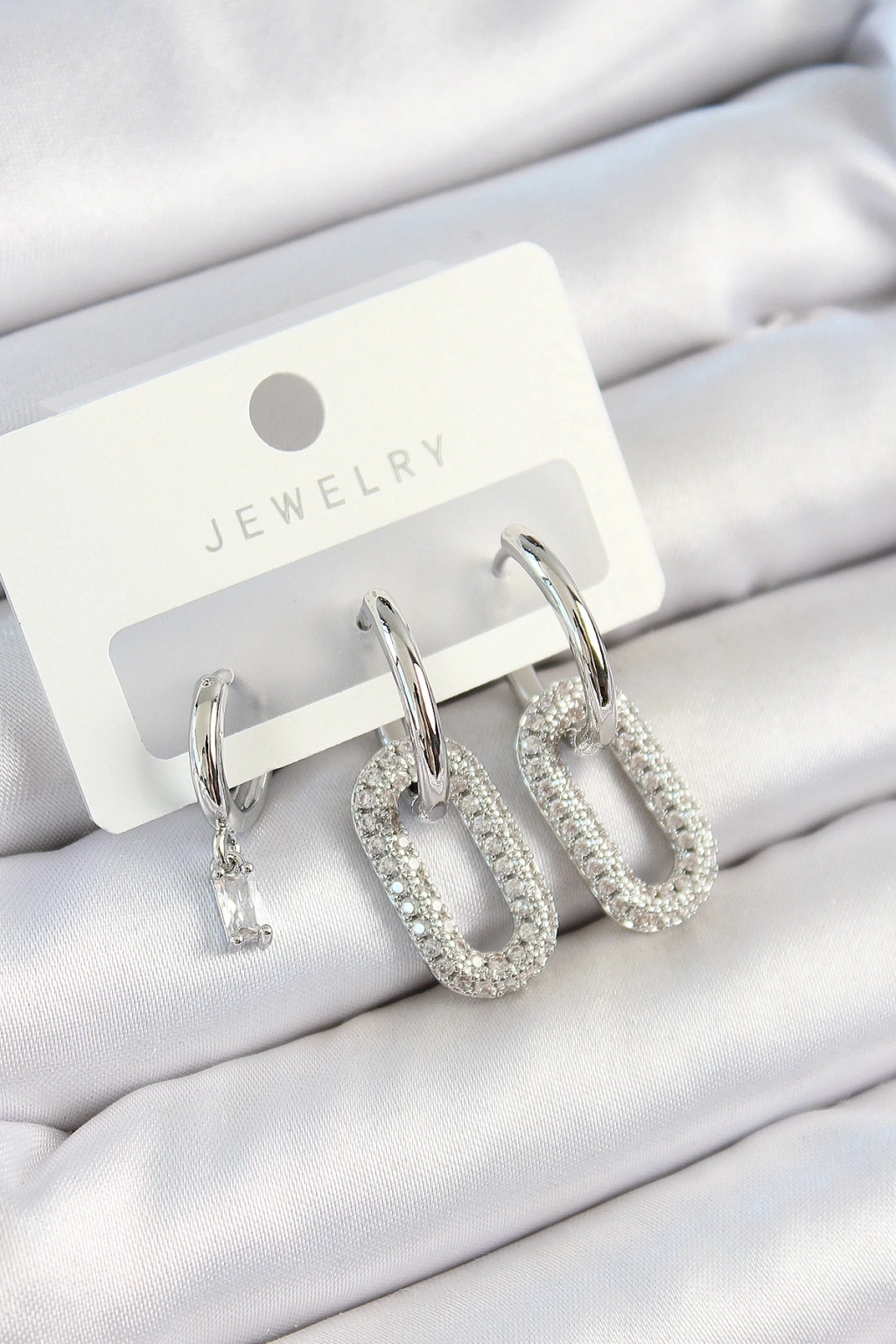 • Pirinç Zirkon Taşlı Dikdörtgen Model Gümüş Renk 3'lü Çift Kadın Küpe Set