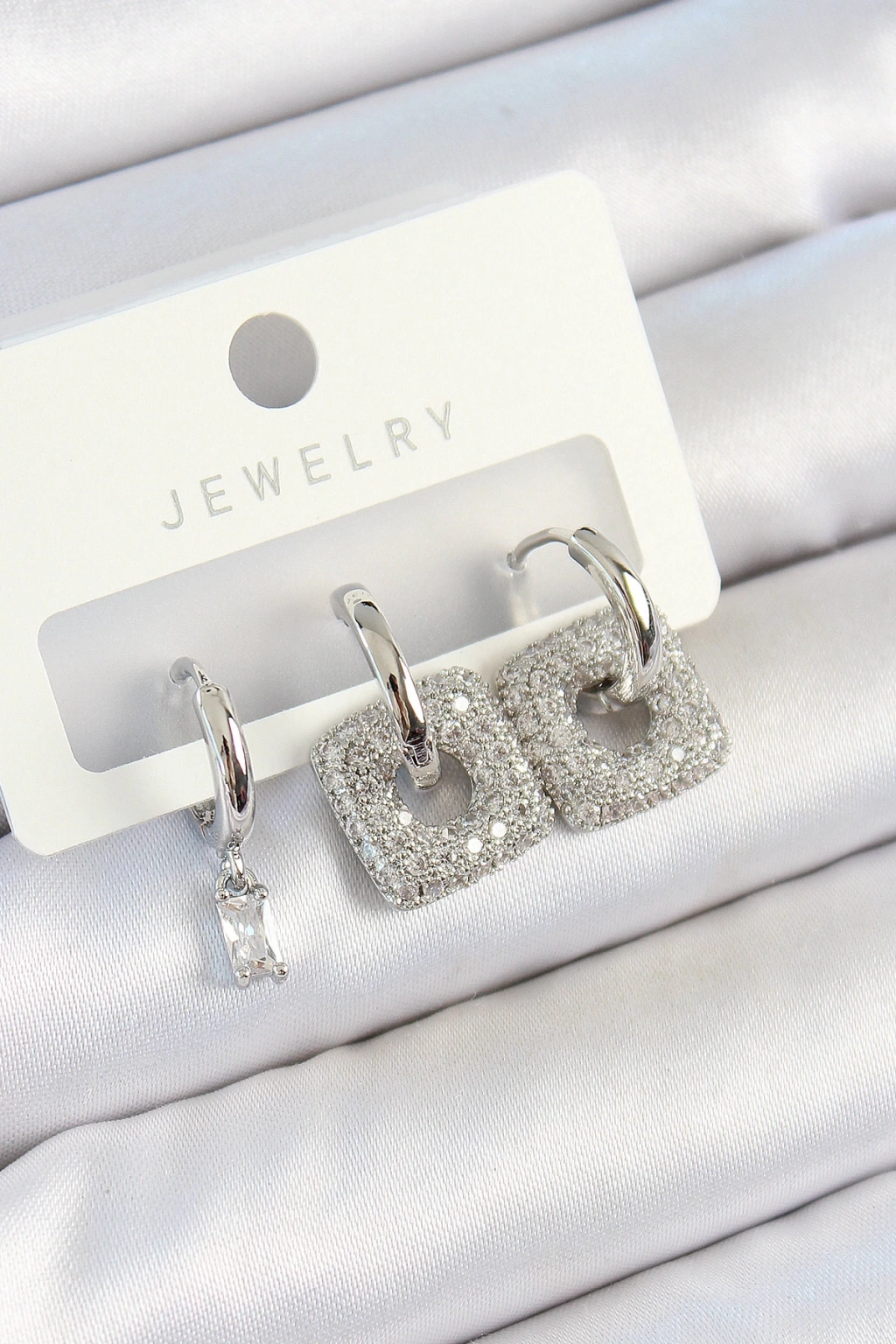 Pirinç Zirkon Taşlı Kare Model Gümüş Renk 3'lü Çift Kadın Küpe Set